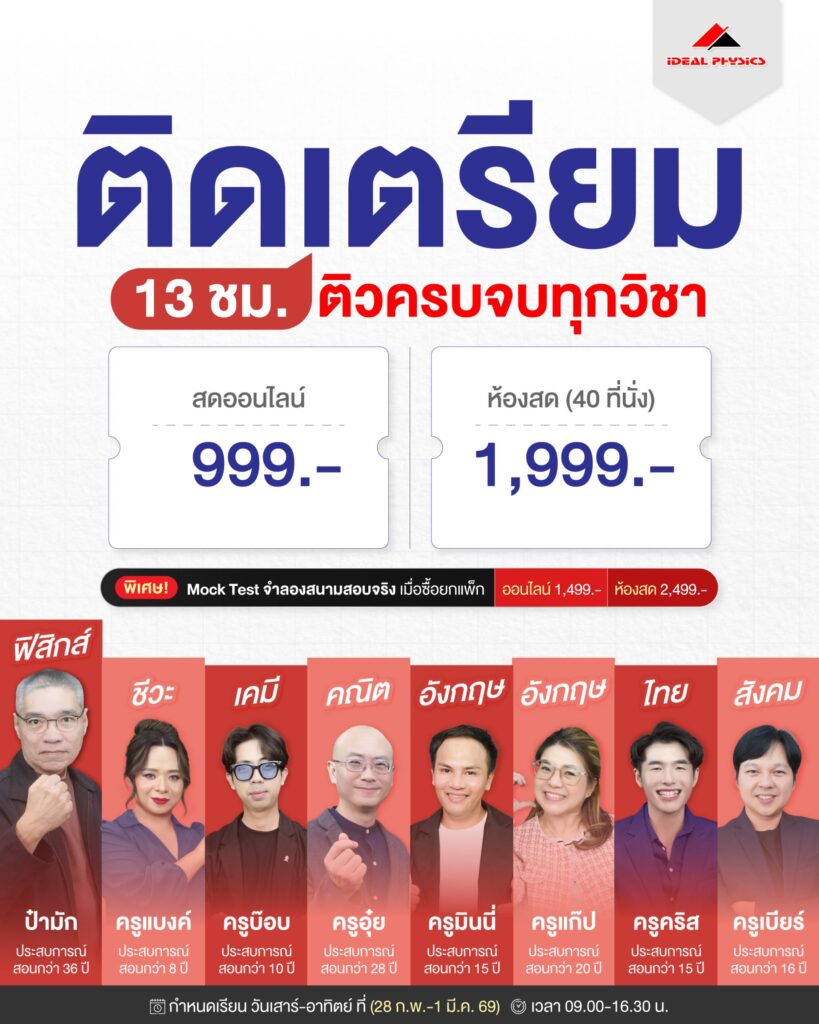 ติวครบทุกวิชาภายใน 13 ชั่วโมง เนื้อหาสรุปสั้น กระชับ ไม่อ้อม ไม่เสียเวลา เน้นเฉพาะหัวใจสำคัญที่ออกสอบบ่อย เหมาะสำหรับการ